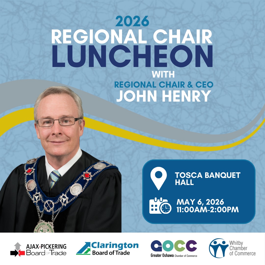 Join us for a Joint Chamber event co-presented by the Ajax-Pickering Board of Trade, Clarington Board of Trade, Greater Oshawa Chamber of Commerce, and Whitby Chamber of Commerce, featuring exclusive insights from John Henry, Regional Chair and CEO of Durham Region, as he shares updates across the region and initiatives impacting our local business community.
