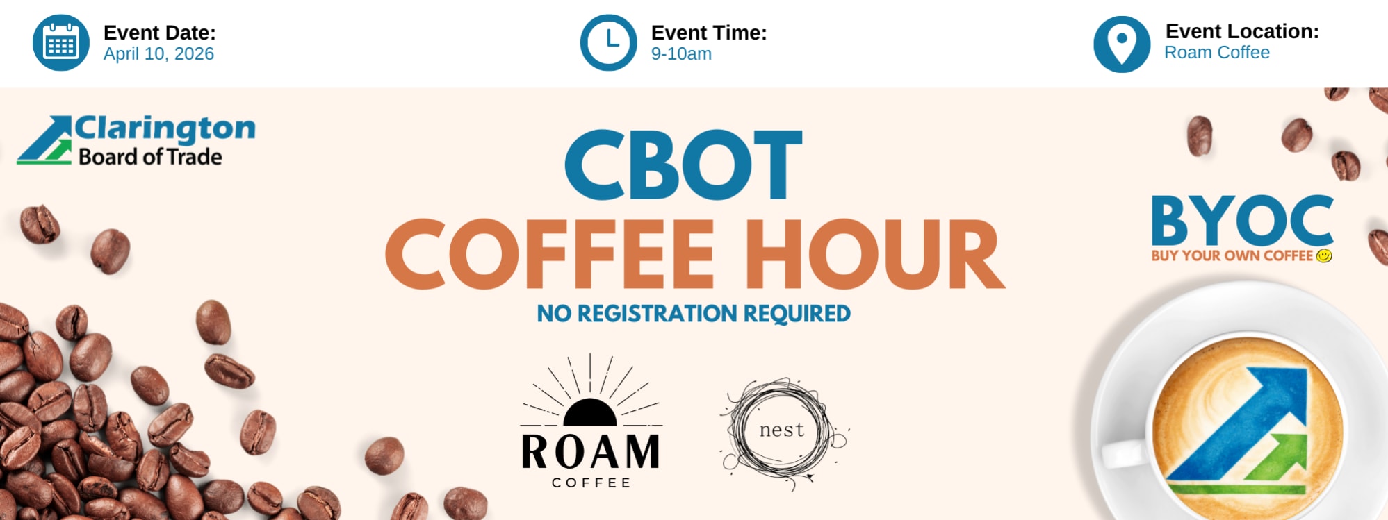 Join fellow members of the Clarington business community at Roam Coffee & Nest Specialty Desserts in downtown Bowmanville for relaxed, non-structured conversation and connection.