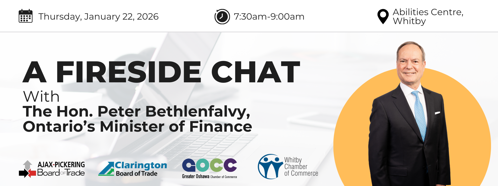 Join business leaders from across Durham Region for a fireside chat with Ontario's Minister of Finance, the Hon. Peter Bethlenfalvy, presented in partnership with the Ajax-Pickering Board of Trade (APBOT), the Clarington Board of Trade (CBOT), the Whitby Chamber of Commerce, and the Greater Oshawa Chamber of Commerce (GOCC).